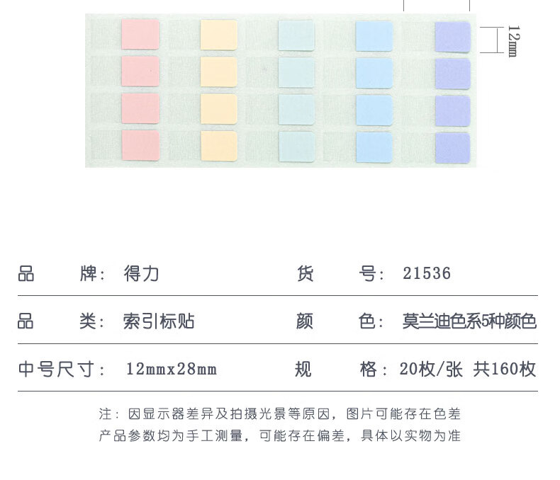 商品名称:得力(deli)160枚小号索引贴标签贴指示贴 考试复习重点归类便利贴记事贴考研 12*28mm 21536 商品编号:218872 品牌:得力 上架时间:2024-09-06 商品毛重:0克