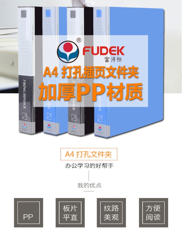 商品名称:富得快 打孔文件夹336U/D(蓝色)四孔 商品编号:219313 品牌:富得快 上架时间:2024-09-24 商品毛重:0克
