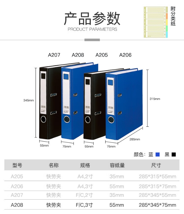 商品名称:齐心 A205 A4 2寸半包胶快劳夹 黑 6个装 商品编号:220004 品牌:齐心 上架时间:2024-10-18 商品毛重:0克
