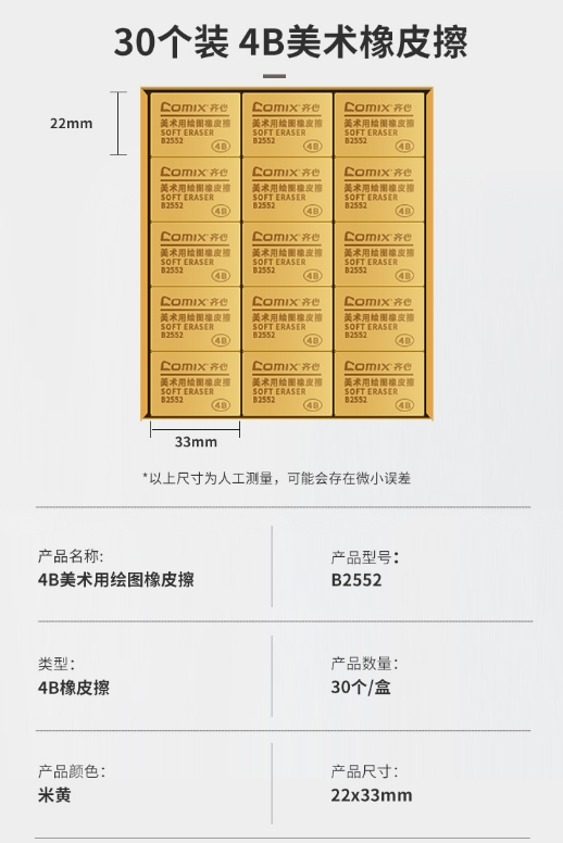 商品名称:齐心 B2552-X 4B美术用橡皮擦(小) 棕 30块/盒 商品编号:220161 品牌:齐心 上架时间:2024-10-18 商品毛重:0克