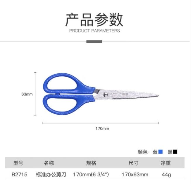 商品名称:齐心 B2715 标准办公剪刀(170mm 中号) 蓝 商品编号:220187 品牌:齐心 上架时间:2024-10-18 商品毛重:0克