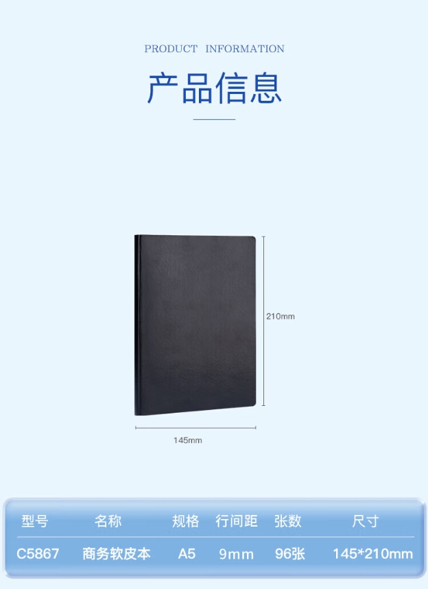 商品名称:齐心 C5867 软皮皮面本A5 96张 黑 商品编号:220386 品牌:齐心 上架时间:2024-10-20 商品毛重:0克