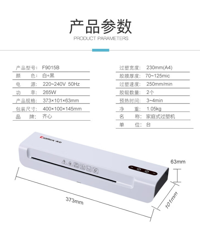 商品名称:齐心 F9015B A4家用式过塑机F9015B-QX01 白+黑 商品编号:220525 品牌:齐心 上架时间:2024-10-22 商品毛重:0克