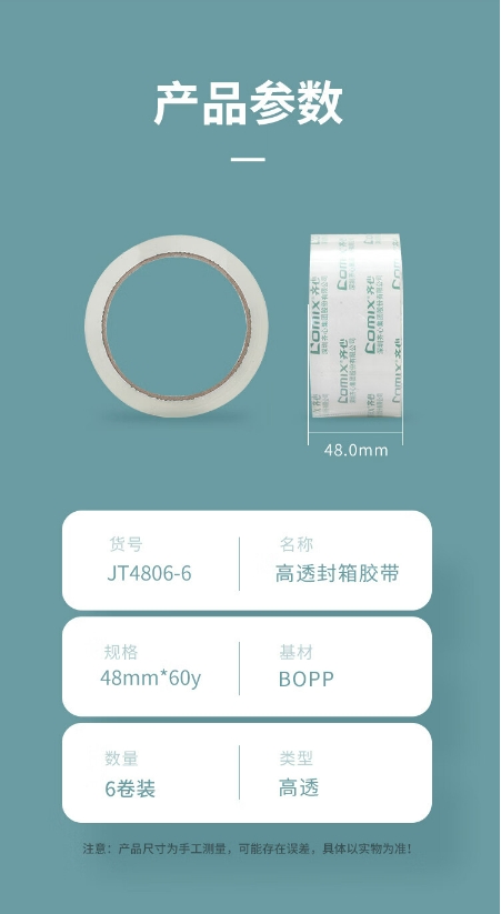 商品名称:齐心 JT4806-6 封箱胶带48mm*60y*50um(6卷/筒) 高透明 商品编号:220615 品牌:齐心 上架时间:2024-10-23 商品毛重:0克