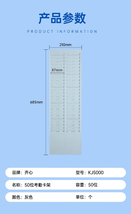 商品名称:齐心 KJ5000 50位考勤卡架 灰 商品编号:220643 品牌:齐心 上架时间:2024-10-23 商品毛重:0克