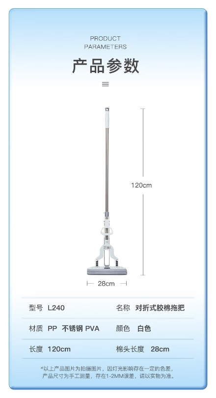 商品名称:齐心L240 对折胶棉拖把 棉头长28CM 1杆1头 白色(不锈钢直杆) 商品编号:220673 品牌:齐心 上架时间:2024-10-23 商品毛重:0克