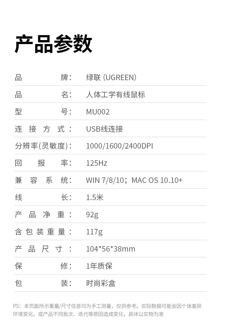 商品名称:绿联(UGREEN)鼠标 MU002有线鼠标 办公鼠标 轻音鼠标 对称鼠标 家用办公笔记本电脑台式机 商品编号:220850 品牌:绿联 上架时间:2024-10-25 商品毛重:0克