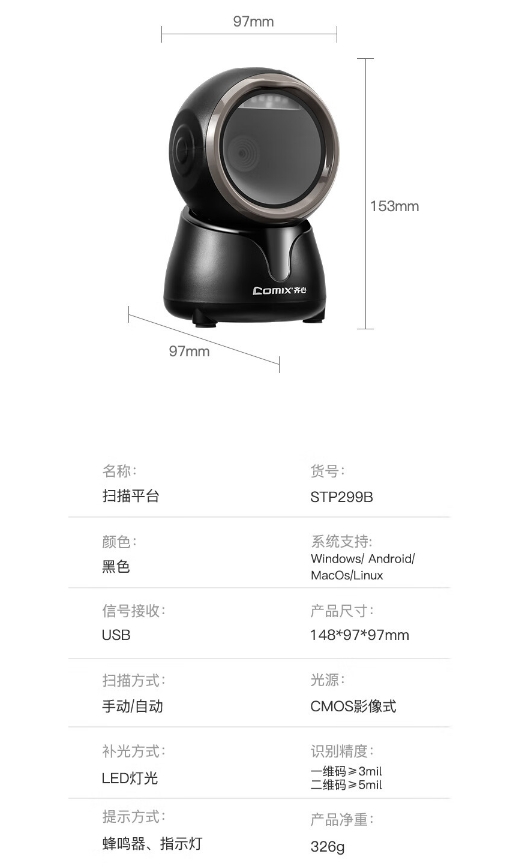 商品名称:齐心 STP299B 二维影像式扫描平台 黑 商品编号:220940 品牌:齐心 上架时间:2024-10-25 商品毛重:0克