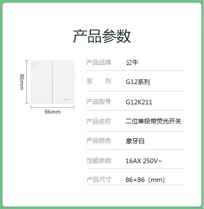 商品名称:公牛(BULL)二开单控插座开关 白色 商品编号:221614 品牌:公牛 上架时间:2024-11-07 商品毛重:0克