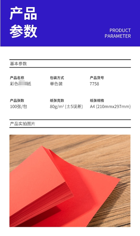 - 商品名称:得力(deli)A4 80g大红色粉纸 100张/包7757
