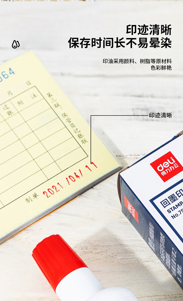 商品名称:得力(deli)30ml水性回墨印油 发票合同财务回墨印章用油 办公用品 红色79900 商品编号:222345 品牌:得力 上架时间:2024-12-02 商品毛重:0克