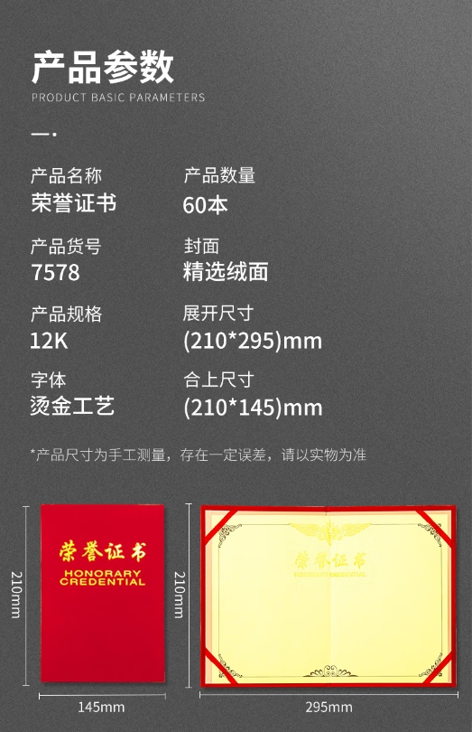 商品名称:得力(deli)单本12K绒面荣誉证书附带内芯 典礼表彰场合适用 红色7578 商品编号:224511 品牌:得力 上架时间:2025-03-17 商品毛重:0克