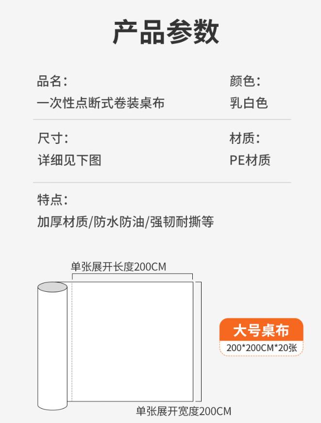 商品名称:特美居 一次性桌布加厚200*200cm*20张 商品编号:225717 品牌:特美居 上架时间:2025-05-12 商品毛重:0克