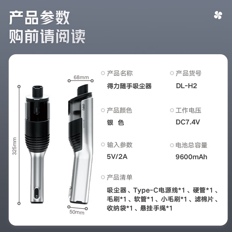 商品名称:得力(deli)车载吸尘器无线大吸力手持汽车用强力小型吸尘器家用无刷吸