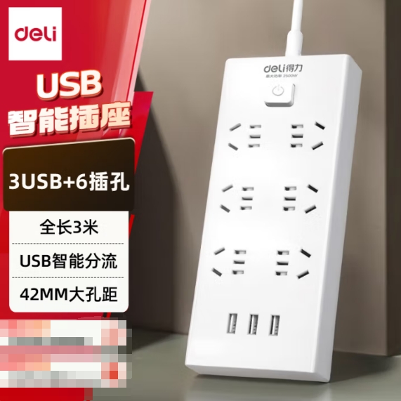 得力(deli)USB智能插座 3USB接口+6孔 总控3米 18284-03