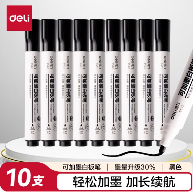 商品名称:得力(deli)可加墨白板笔10支/盒DL-S502 商品编号:226805 品牌:得力 上架时间:2025-06-25 商品毛重:0克