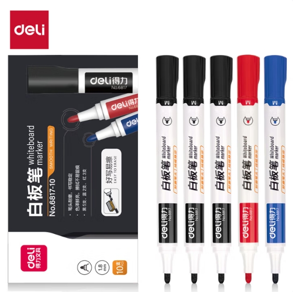 商品名称:得力(deli)白板笔套装 5黑3红2蓝混色 10支/盒 6817-10 商品编号:227341 品牌:得力 上架时间:2025-07-15 商品毛重:0克