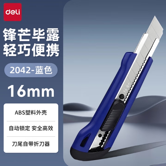 商品名称:得力大号美工刀【金属款】1把装 自动锁定(蓝) 商品编号:228745 品牌:得力 上架时间:2025-09-18 商品毛重:0克