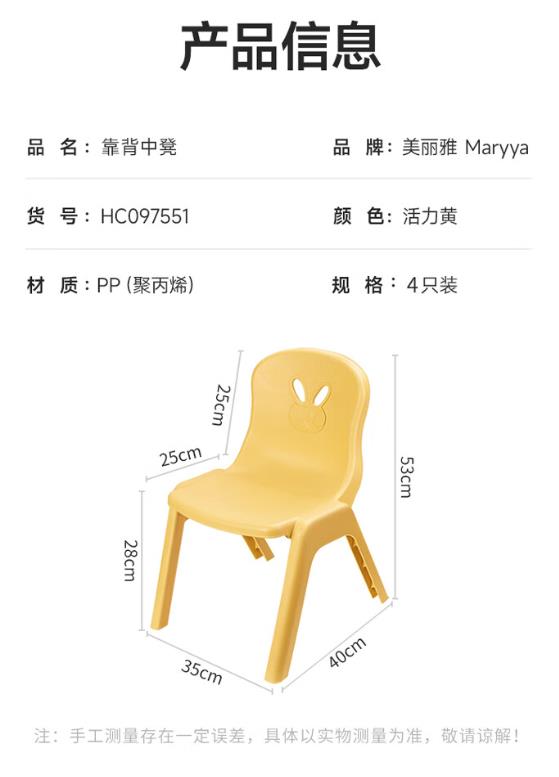 商品名称:儿童塑料凳子 4只装 商品编号:228817 品牌:美丽雅 上架时间:2025-09-18 商品毛重:0克
