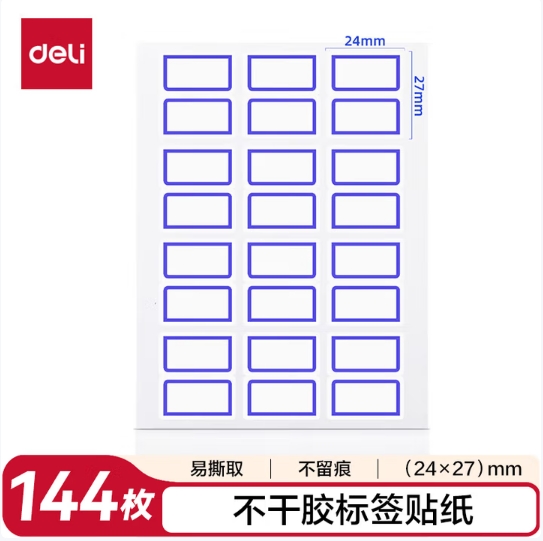 得力(deli) 144枚24*27mm蓝框不干胶标签贴纸7194