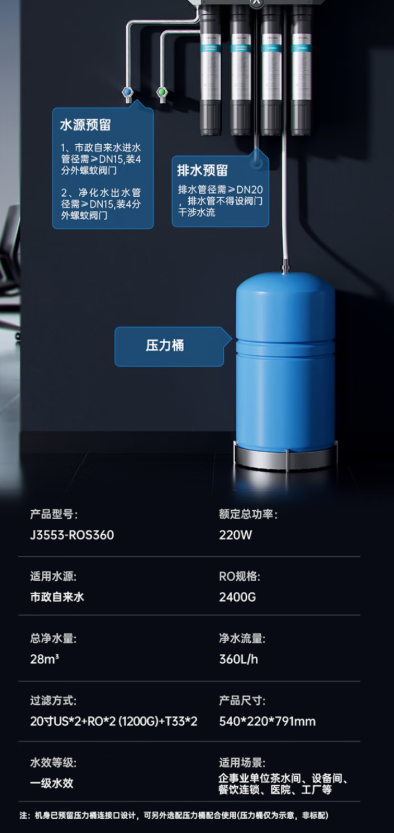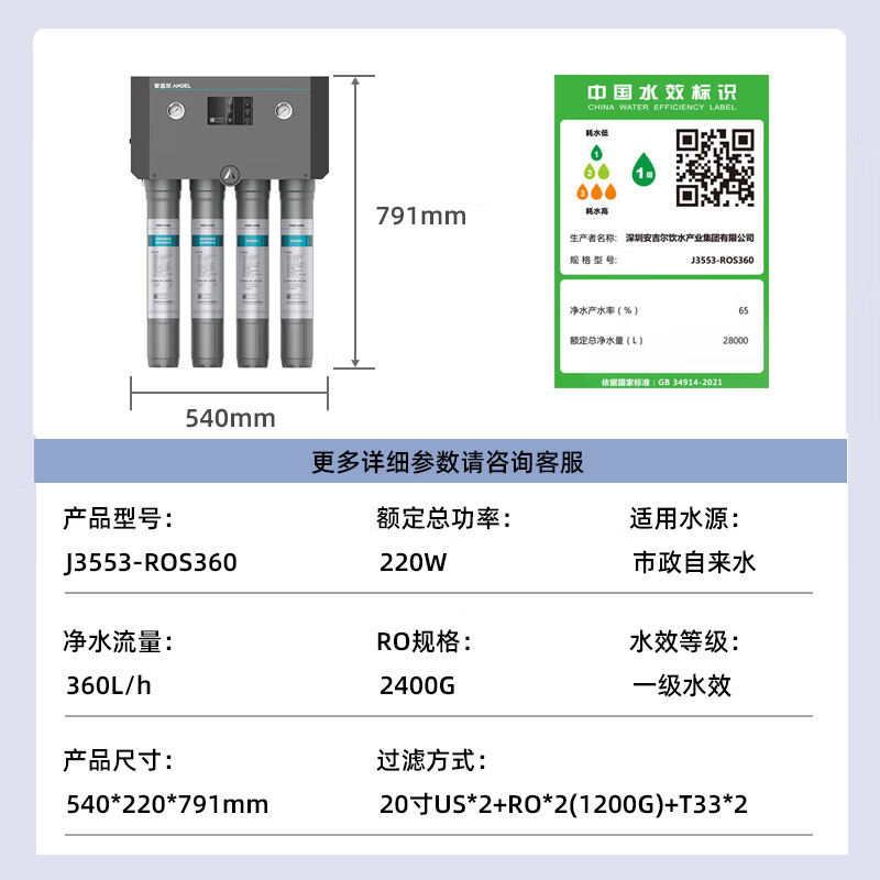 商品名称:安吉尔商用餐厨反渗透净水器2400G大通量 J3553-ROS360 6L/min 额定总净水量28m³ 商品编号:230232 品牌:安吉尔 上架时间:2025-11-10 商品毛重:0克