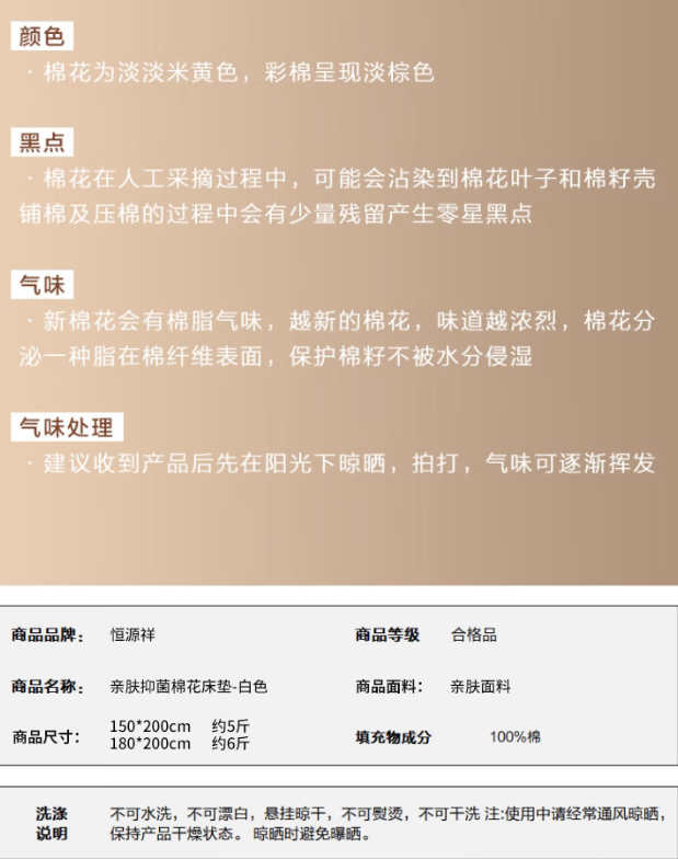 商品名称:恒源祥新疆棉花床褥床垫 抗菌双人褥子垫被软垫棉花絮垫150*200cm 商品编号:230235 品牌:恒源祥 上架时间:2025-11-10 商品毛重:0克