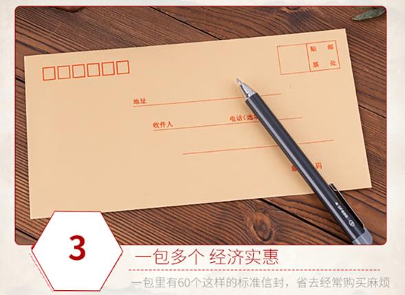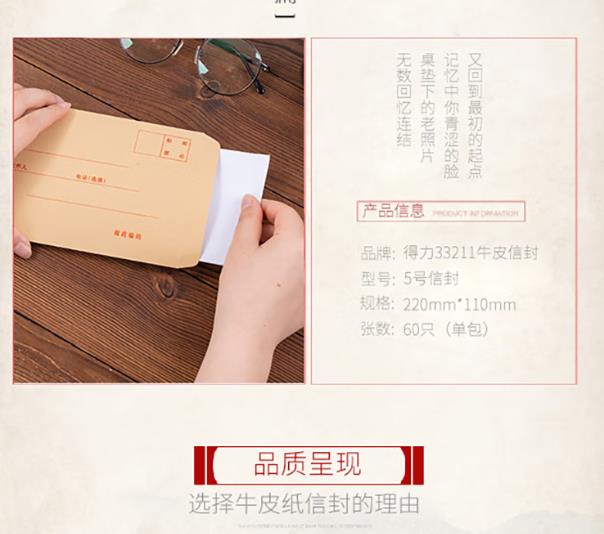 商品名称:得力 60个装5号牛皮纸信封 220*110mm 33211 商品编号:230332 品牌:得力 上架时间:2025-11-13 商品毛重:0克