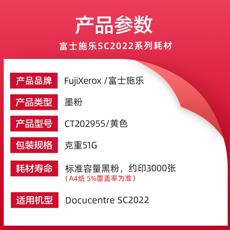 商品名称:富士胶片(原富士施乐)施乐SC2022CPS DA原装粉盒墨粉墨盒sc2022硒鼓显影组件定影感光鼓 黄色小容CT202955(可印3000张) 商品编号:230393 品牌:富士胶片 上架时间:2025-11-18 商品毛重:0克