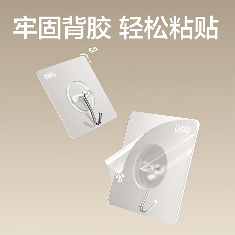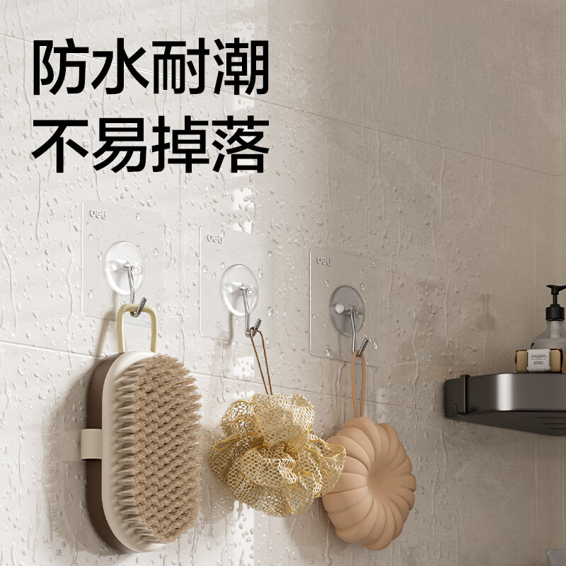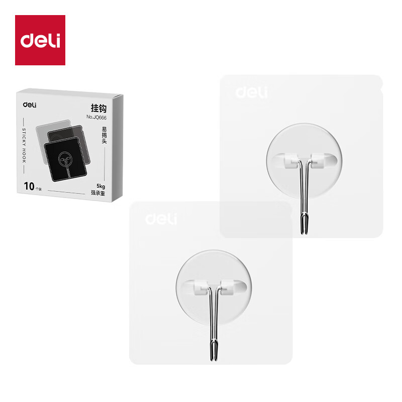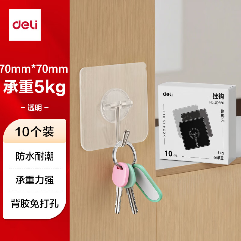 得力(deli)无痕透明厨房浴室免打孔无痕胶双面胶挂钩 10个/盒 JQ666