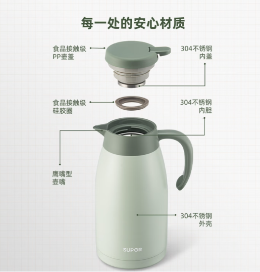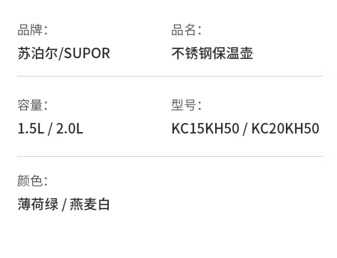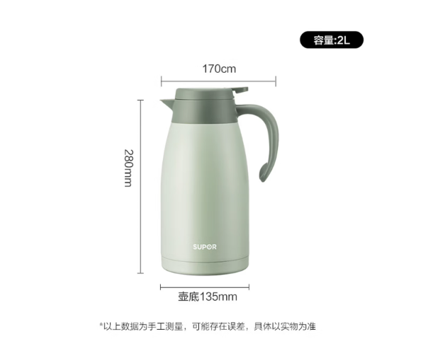 商品名称:苏泊尔(SUPOR)家用真空保温瓶暖水壶2.0L薄荷绿 KC15KH50/KC20KH50