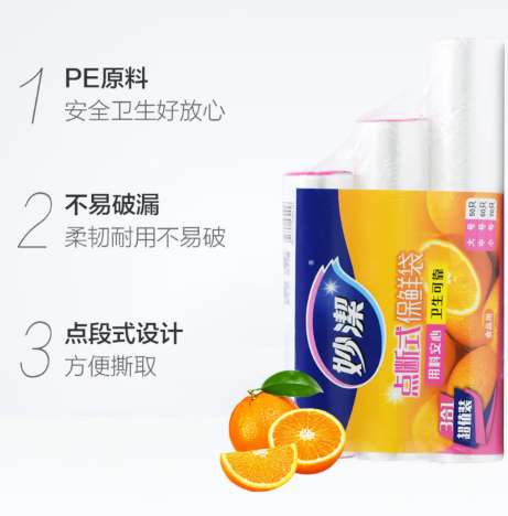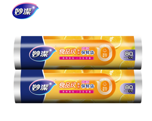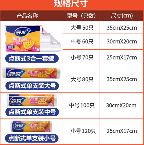 商品名称:妙洁保鲜袋食品级塑料袋食品袋大号中号小号组合装点断式PE保鲜袋 大号2卷160只(35*25cm)