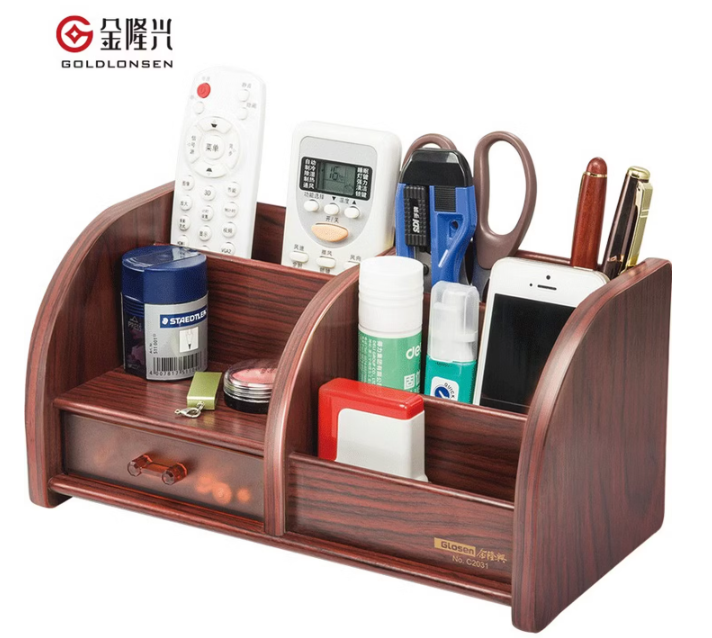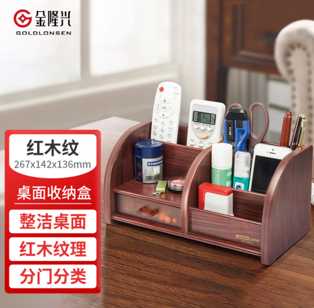 商品名称:金隆兴 多功能木质笔筒摆件 办公桌面置物大容量办公文具用品抽屉遥控器收纳盒 红木纹 C2031