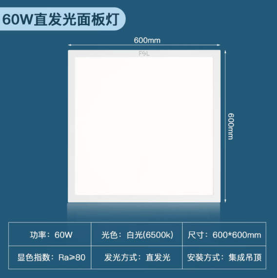 商品名称:FSL佛山照明LED集成吊顶灯面板灯平板灯办公室嵌入式铝扣板天花灯60W白光尺寸600*600V型白光6500K 商品编号:231017 品牌:佛山照明 上架时间:2025-12-12 商品毛重:0克