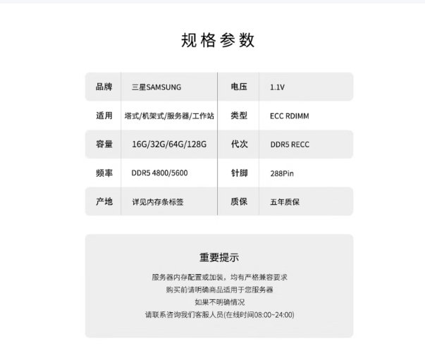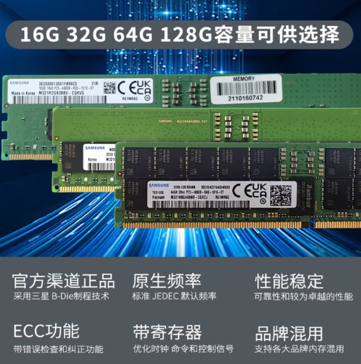 商品名称:三星(SAMSUNG)DDR5 RECC服务器内存条 PC5 4800/5600/6400 ECC RDIMM REG工作站内存条 64G DDR5 4800 RECC服务器内存 商品编号:231348 品牌:三星 上架时间:2025-12-31 商品毛重:0克