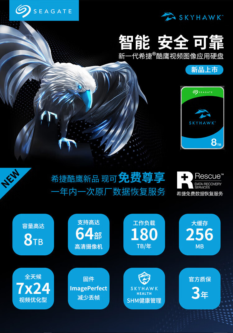 商品名称:希捷(SEAGATE)安防硬盘 8TB 256MB SATA CMR垂直 机械硬盘 视频储存 数据恢复服务 希捷酷鹰 3.5英寸ST8000VX009 商品编号:231471 品牌:希捷 上架时间:2026-01-13 商品毛重:0克