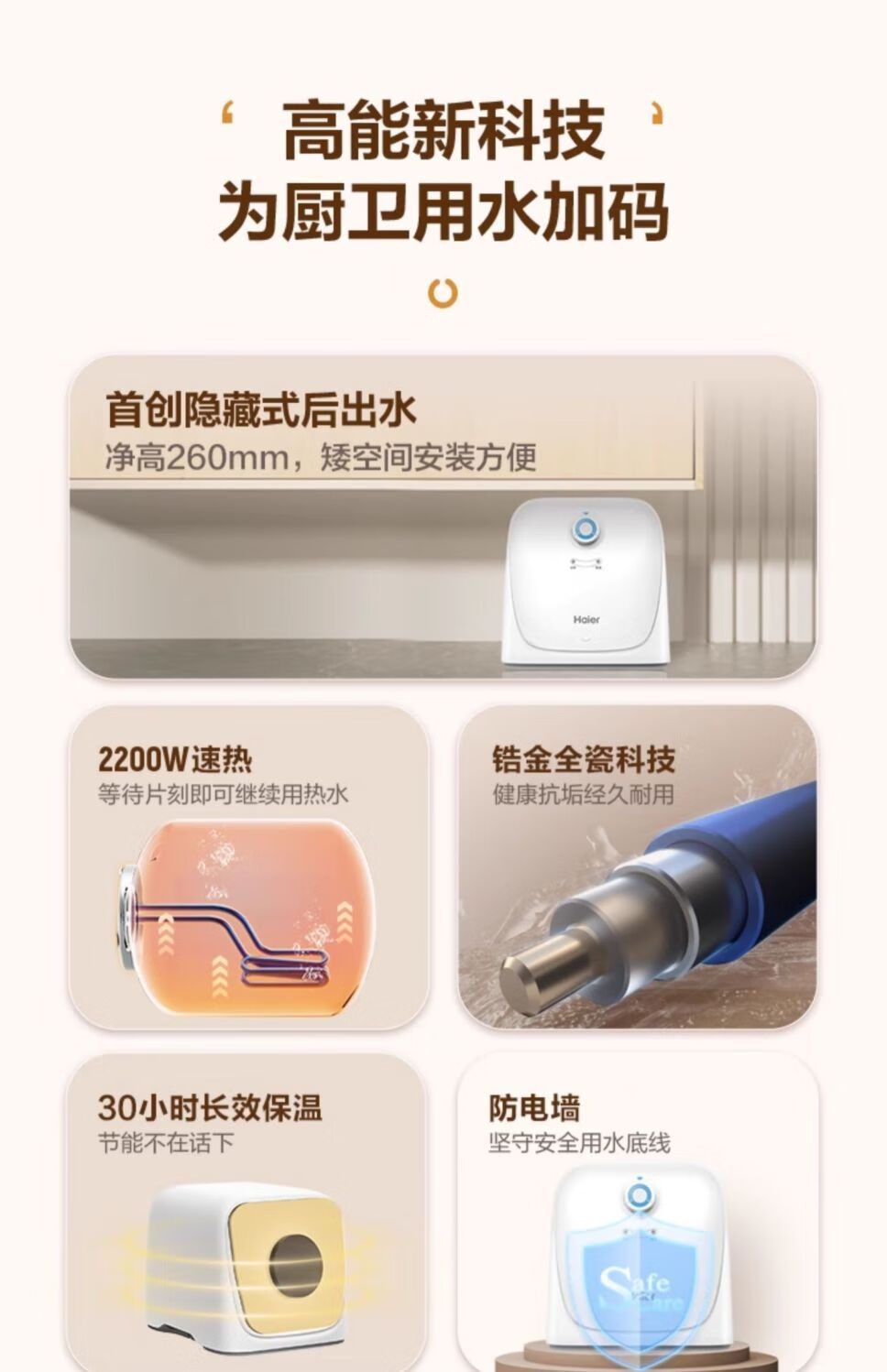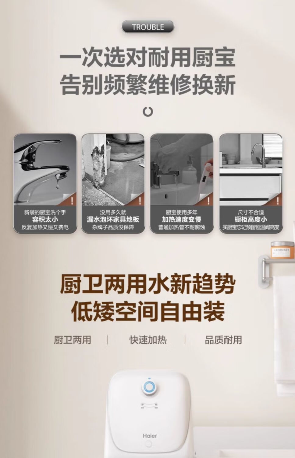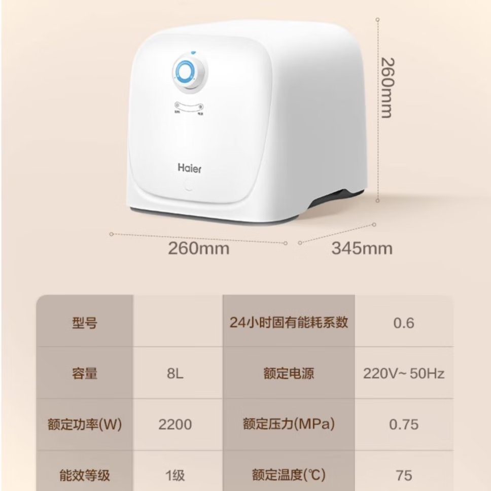 商品名称:海尔8升小厨宝一级能效2200瓦功率小体积厨房卫生间洗手速热节能小型热水器ES8 8L 2200W 海尔小体积厨宝 商品编号:232478 品牌:海尔 上架时间:2026-03-20 商品毛重:0克