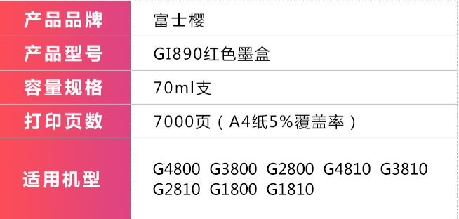 商品名称:富士樱 墨水 GI-890M 商品编号:063339 品牌:富士樱 上架时间:2018-09-25 商品毛重:0克