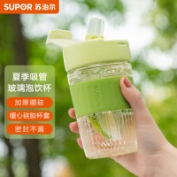 苏泊尔SUPOR 玻璃水杯小浪杯便携夏季泡茶大容量咖啡杯子ins风 360ml抹茶绿吸管K